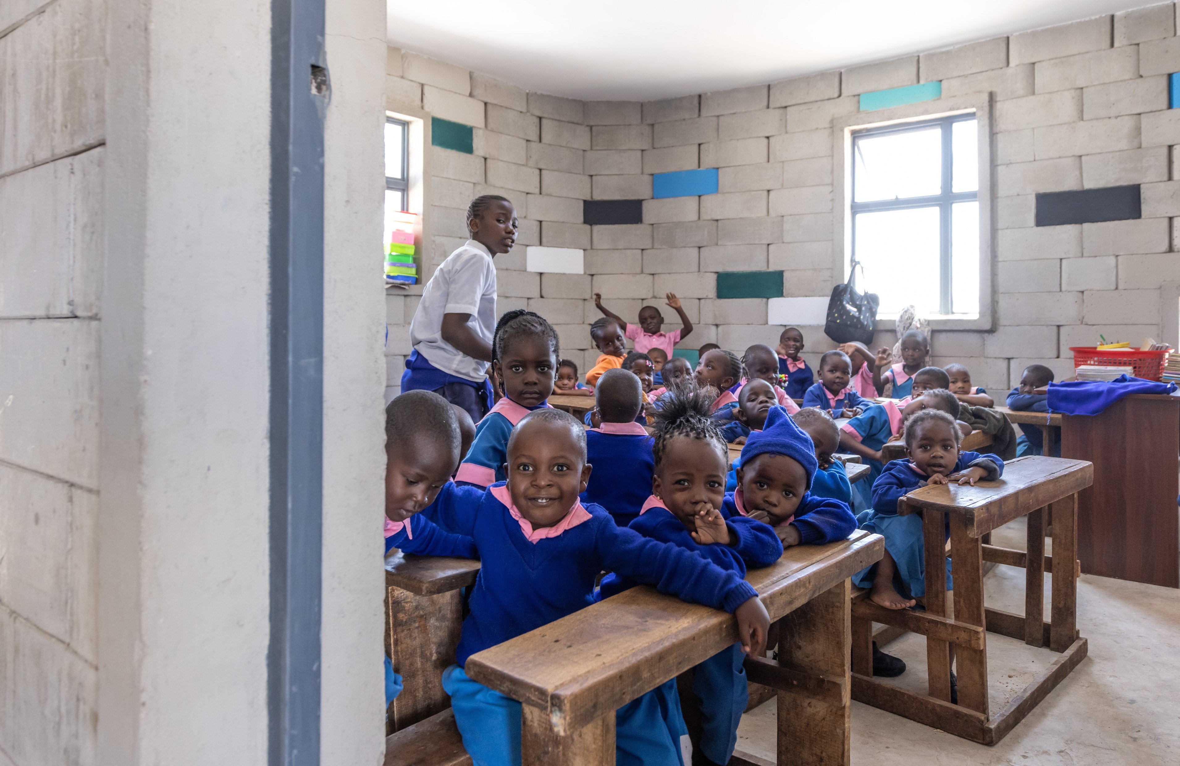 The walls of the school in Kibera are made up of 7,000 TwistBlocks. The fire-resistant blocks feature an impressively simple plug-in system which, in addition to being quick and easy to use, allows the ground plan to be designed flexibly in confined spaces. The cavity inside the blocks also ensures good insulation and pleasant room temperatures in summer and winter. The construction process is therefore very straightforward and requires neither mortar nor trained bricklayers. With a construction time of only one year for the school building, the TwistBlock method sets new standards in terms of rapid construction.