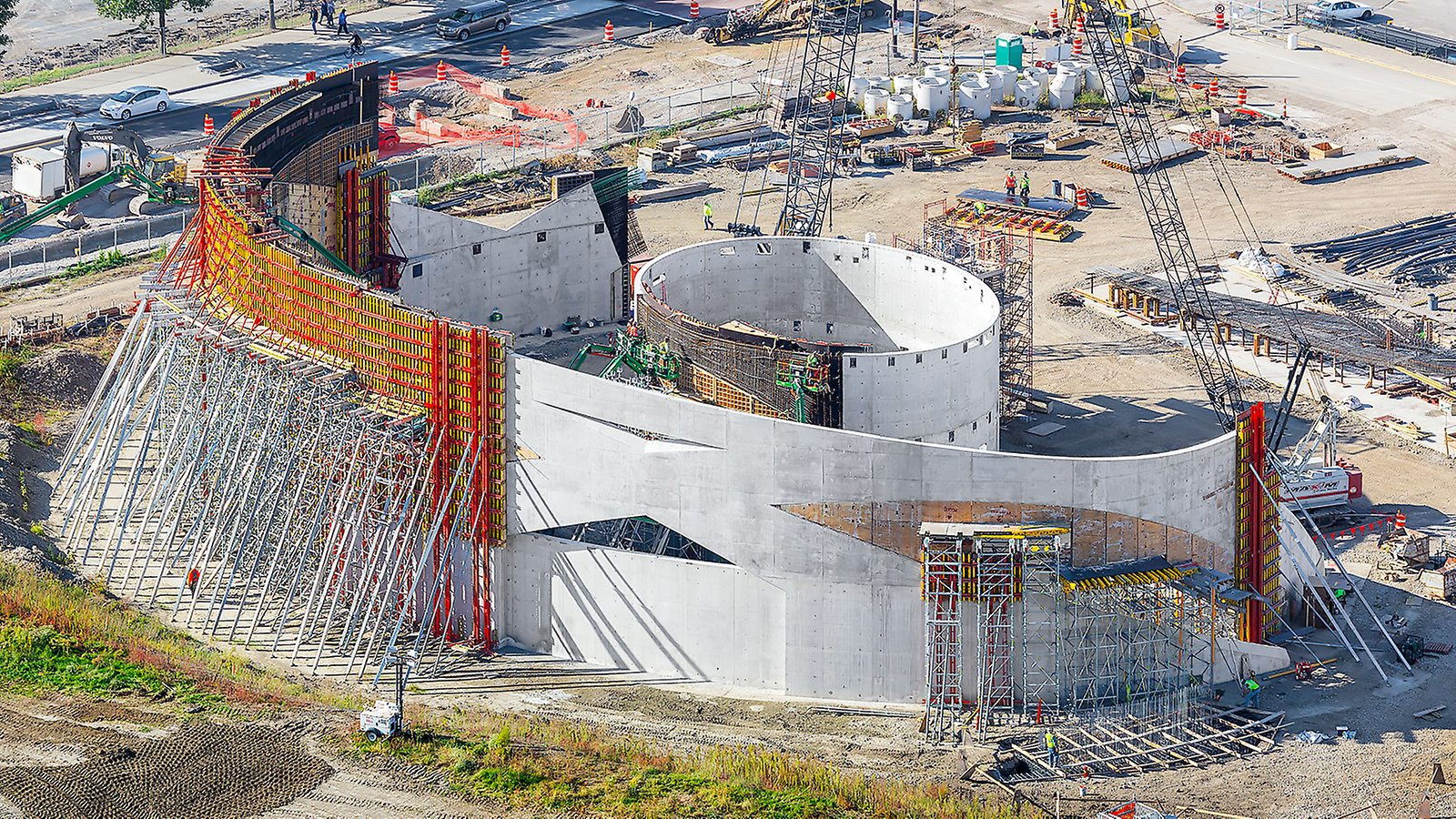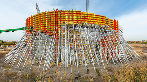 Due to the curved walls and the high exposed concrete requirements, our VARIO 24 girder wall formwork was one of those solutions, supported with our PERI UP shoring. In addition, 15-metre-high panels were used for the walls and had to be kept stable during concreting. For static challenges like these, Dan's knowledge of physics came in handy. He decided to use our RCS rail climbing system which was connected to the high panels and anchored to the ground. This made it possible to pour concrete at greater heights without the panels falling down.