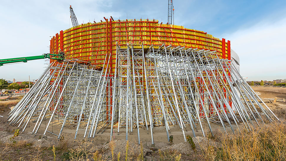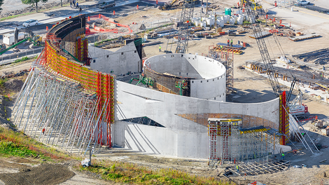 The building consists of only curved structural arches which form three big concrete rings, overlapping each other. This creates up to 400 different openings and had to be considered in the formwork designs. 18-metre-high walls made the task no easier. But the biggest challenge of all was the constant change in structure. “We always had to look at the building from a new perspective for each section and see how we could tackle the next area because the ever-changing geometry didn’t allow the reuse of any panels,” our engineer explains.
