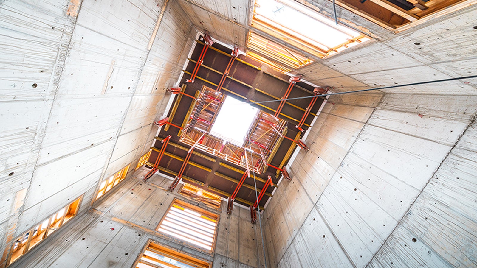 The MAXIMO panel formwork system, paired with RCS hydraulic climbing technology, further streamlined core construction. Hydraulic climbing freed the crane for other tasks, while hydraulic stripping elements made form removal faster and more efficient.