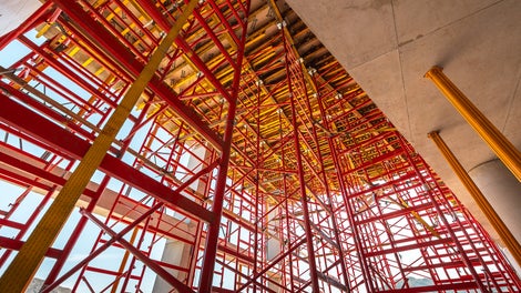 PERI UP Flex Modular Scaffolding supported the architectural stair towers, reaching a height of 62 feet. The PERI UP system was then dismantled level by level to allow the architectural staircases to be used. The PERI UP scaffold system allows for nearly limitless adjustments to suit local site conditions while meeting the highest safety requirements for working areas.