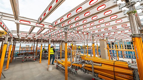 In addition to SKYFLEX, PERI USA provided MAXIMO with RCS for elevator shafts, Alpha Columns for vertical columns support, and MULTIPROP for load-bearing shoring. The RCS system had not been used by JP Cullen before but was selected to maintain a two-day construction cycle for vertical cores. After an initial learning curve, the crew quickly adapted, keeping the schedule on track.